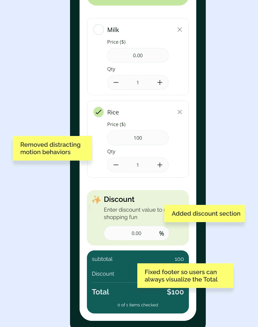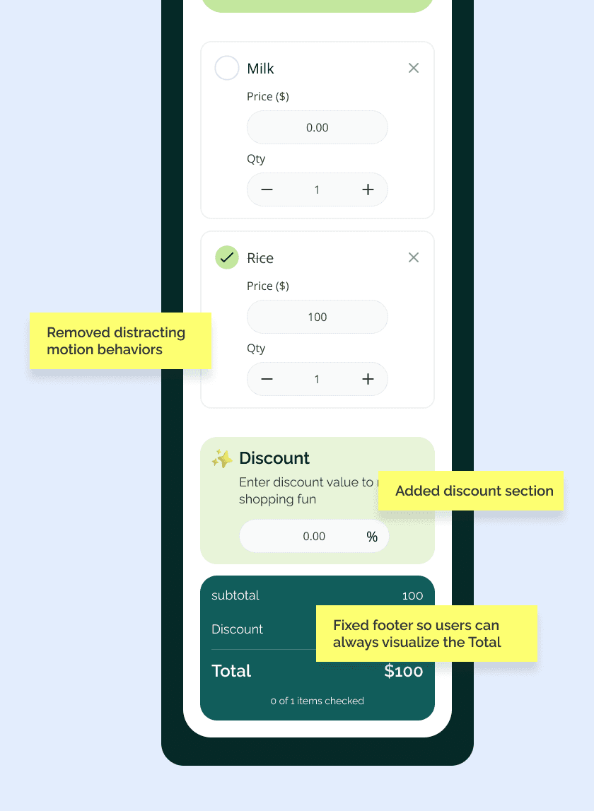 The solution focused on refining the flow by incorporating a key "Should Have" feature: Discount section. This adjustment was supported by design refinements to improve clarity and reduce friction.